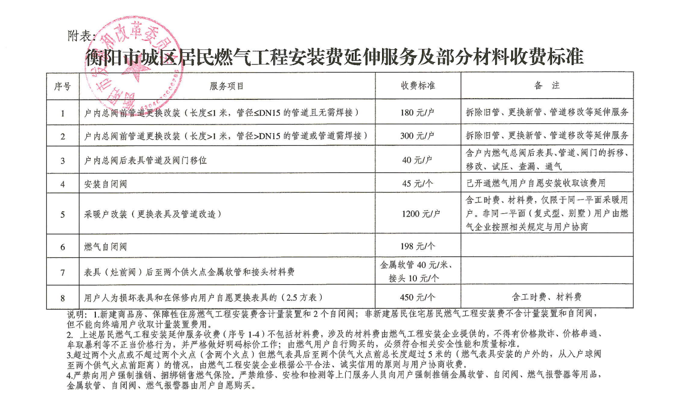 根據衡陽市發展和改革委員會《關于規范市中心城區燃氣工程安裝收費有關事項的通知》(衡發改價商〔2024〕2號)文件規定: